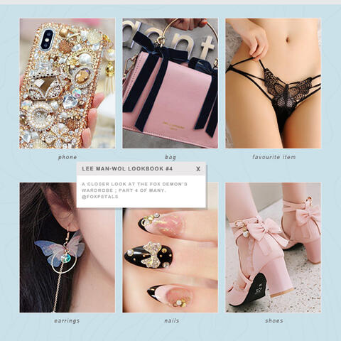 ⊱ she loves lace and frills. and fabric flowers. anything with flowers or butterfly patterns. she owns many trinkets and accessories with those themes, as well as moons and foxes. her favourite item is a trinket her mother made for her consisting of a golden fox head with a blue butterfly and a silver moon underneath, followed by a golden tassel.❁⃟𝐇𝐎𝐁𝐁𝐈𝐄𝐒.